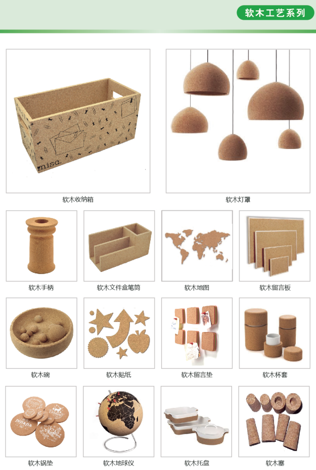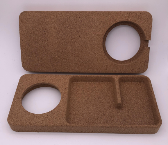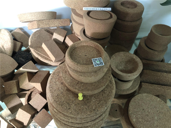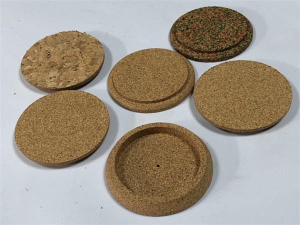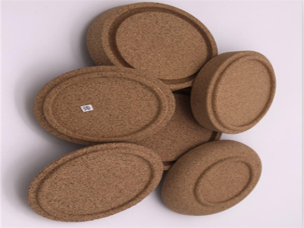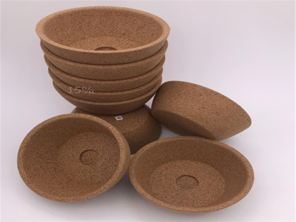 用天然软木粒加聚氨酯胶搅拌均匀,放入定型模具经过热压,高温烘焙定型、养生、脱模、修边、打磨等工序加工成型