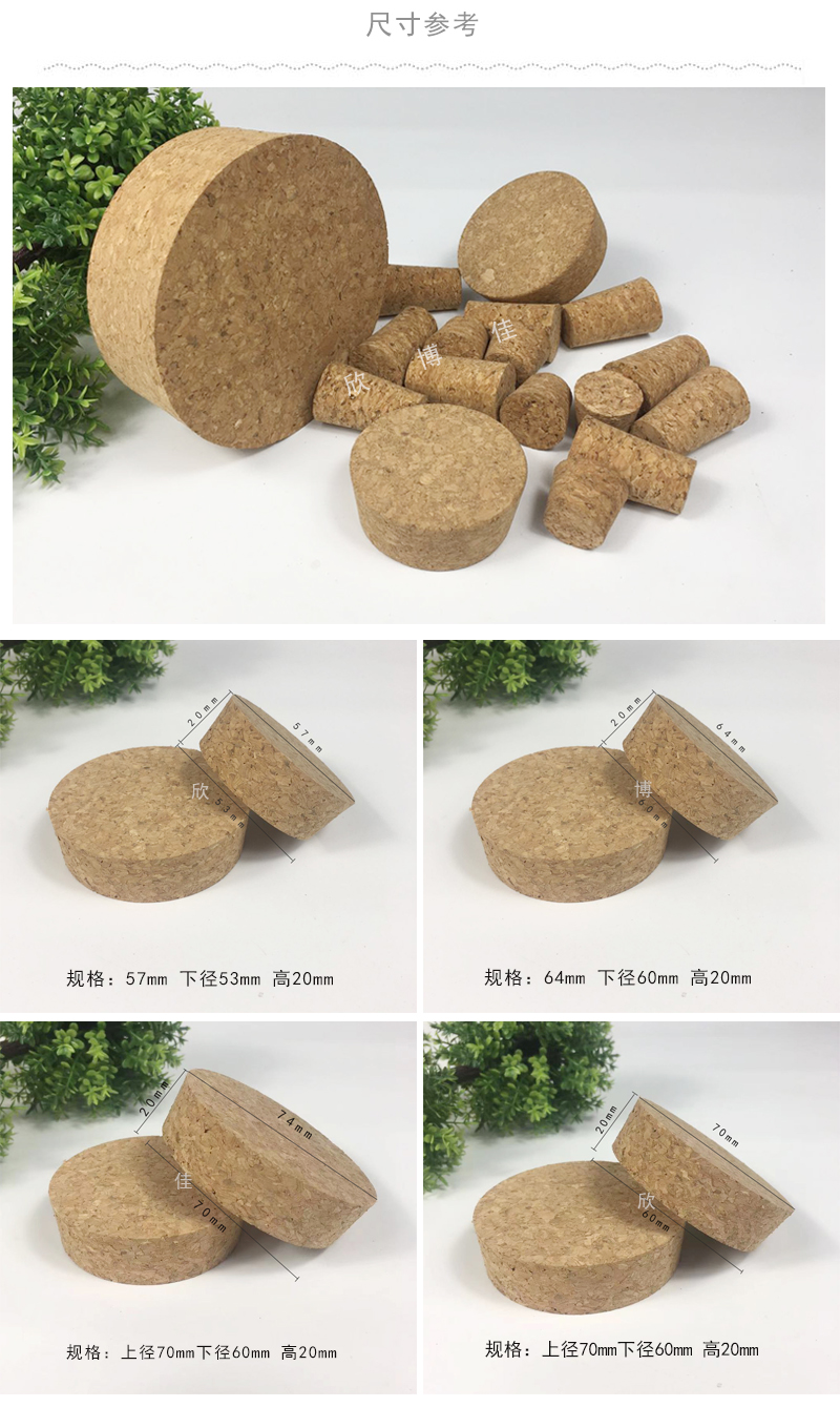 2、各种异型软木塞均可定做如:合成软木塞、天然软木塞、锥型塞、T型塞、直型塞、蘑菇塞、圆形软木密封塞等